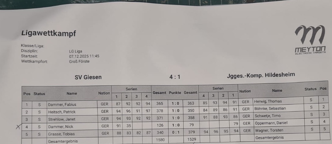 Am Sonntag fand unser Heimwettkampf in Groß Förste statt. Trotz großem Einsatz mussten wir uns leider sowohl dem Schützenverein Telgte von 1922 e.V. als auch dem Schützenverein „Vaterland“ Gross Giesen e.V. jeweils mit 4:1 geschlagen geben.