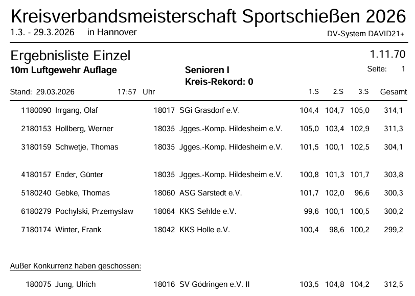 Am letzten Wochenende der Kreismeisterschaften des Sportschützenverbandes Hildesheim-Marienburg standen die Auflagewettbewerbe in den Disziplinen Luftdruck und KK 100-Meter auf dem Programm. Auch hier können die Junggesellen auf einen erfolgreichen Wettkampftag zurückblicken.