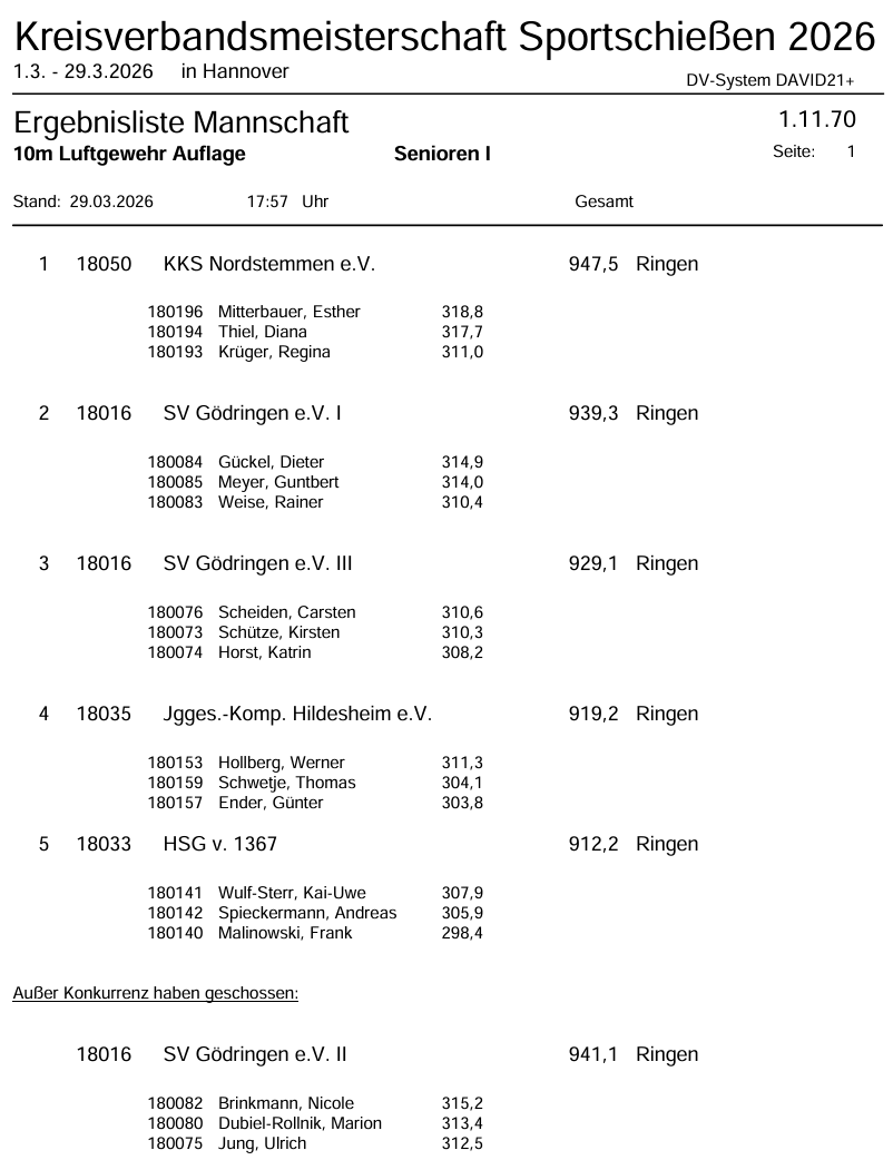 In der Mannschaftswertung der Seniorenklasse I erreichte unsere Mannschaft einen starken 4. Platz hinter dem KKS Nordstemmen, dem SV Gödringen I und SV Gödringen III. Zur Mannschaft gehörten Werner Hollberg, Thomas Schwetje und Günter Ender an.